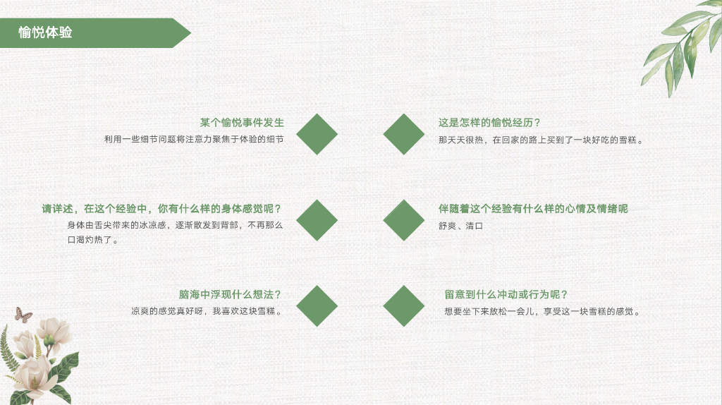 活动初始,小组组长还是以自己的亲身经验为大家讲解怎么进行愉悦日志的体验记录。小组组长通过自我披露的方式和生动形象的描绘,让组员们通俗的了解到愉悦体验的六个记录步骤。