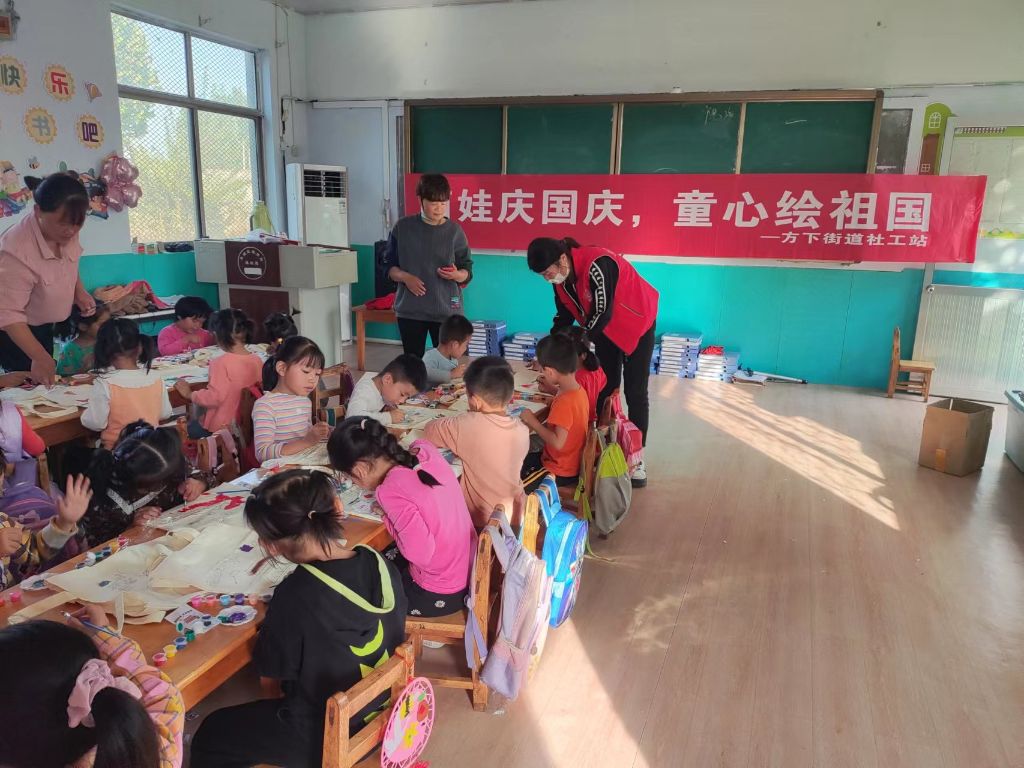 9月30日,方下街道社工站的社工们来到李家义幼儿园,跟孩子们一起开展了一场有意义又趣味十足的庆国庆活动。