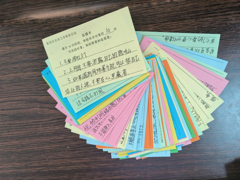 活动开始前,莱芜区社工总站的社工提前与同学们做好课堂约定。随后,总站社工与同学们一起探讨日常生活中网络使用情况及出行场景,并结合动画视频、互动问答等方式深入浅出的讲解网络社交安全、交通安全,引导同学们正确认识网络,学会健康、安全、合理地使用网络,在日常出行时注意交通安全。活动结束后,同学们在反馈卡上纷纷写下今天的收获与感受,并表示在日常生活中以实际行动践行所学知识。