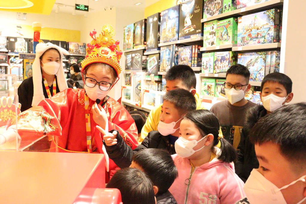 社工带领小朋友们走进乐高门店后,大家的目光一下子就被琳琅满目的乐高积木所吸引,挪不动脚步,柜台上有生动的铃兰花、金色的祥云、充满浓浓年味的街头场景……在店内的中央,还有一位身穿“财神服”的财神主持人,精致的红色服饰非常醒目。“各位小朋友, 我们先玩一个热身游戏,好嘛?游戏的名字叫年兽来了……”随着主持人的亲切开场,小朋友们根据主持人所说的数字,抱团完成游戏,几轮过后,大家很快便和主持人熟络了起来。随后,大家跟着主持人一起探店,了解乐高的魅力。每走到一处乐高产品,主持人就详细地为小朋们介绍,包括大家喜爱的动画片、神话故事、游戏场景等等内容,“我知道,这是艾莎公主!”“这个是超级马里奥里面的库巴。”小朋们激动地向主持人表达自己的所学所想。参观完后,主持人带领小朋友们到“兔年迎春会”的场地,并为每个小朋友发放兔年头饰和贴纸名牌,正式开启了年味十足的迎新春活动。
