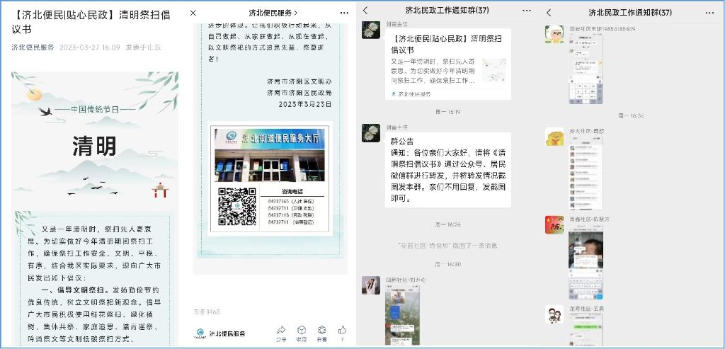 线上宣传,通过街道便民大厅的公众号,发布“文明祭扫倡议书”并在民政工作通知群发布公告,要求各社区民政专员利用社区的网格群广泛宣传,起到了良好的宣传效果。