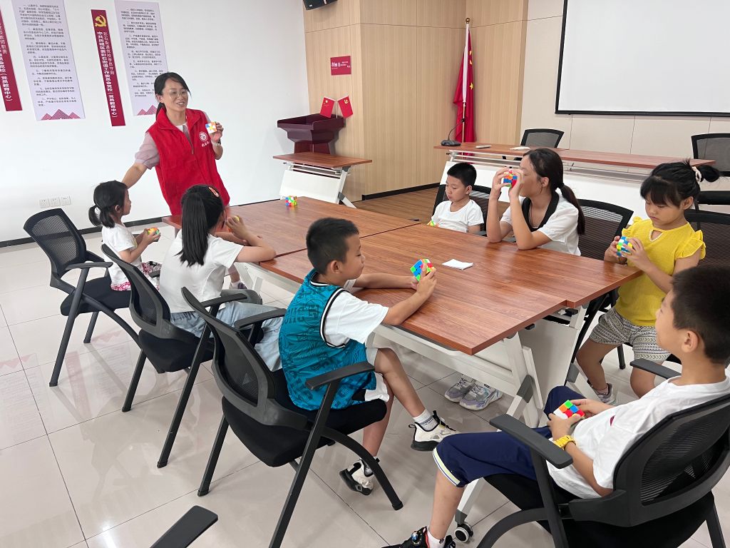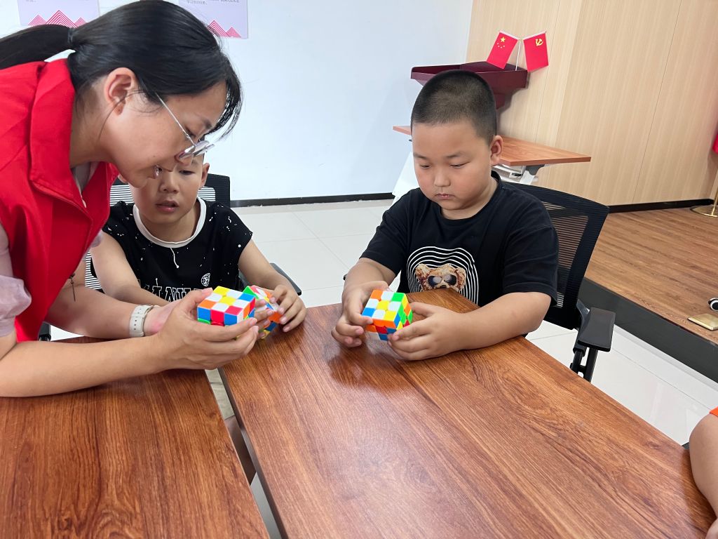 为丰富辖区青少年暑期文化生活,提高思维拓展能力,8月3日彩石街道社工站开展“百变魔方 玩转童年”第二期小组活动。