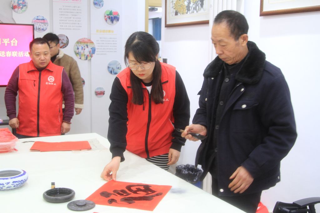 活动现场,社工、社区工作者、志愿者集聚一堂、热情高涨。在社工的配合下,书法志愿者以笔寄情、以字传情,将真挚的祝福付诸笔端,把美好的祝福写进春联里。“山舞银蛇雪舍玉 水生碧浪风带春”“国逢盛世九龙舞 民沐春风万户歌”……不一会儿,一行行俊秀苍劲的书法、一句句墨香四溢的语句、一张张气韵生动的“福”字就呈现在大家眼前,淡淡的墨香让整个现场洋溢着浓浓的年味儿。