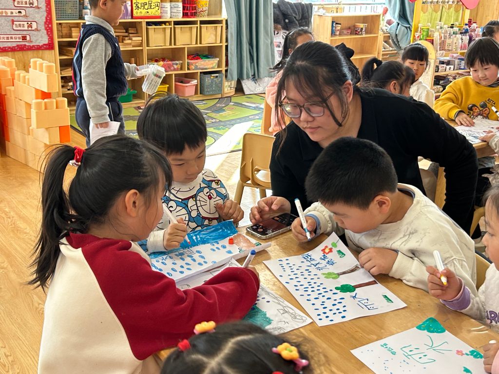 活动前,社工认真收集适合幼儿学习雨水节气的相关资料,制作图文并茂的PPT以及科普视频以便为孩子讲解雨水节气,活动开场,社工化身知识讲解员,以通俗易懂的方式将知识传递给孩子们。绘画过程中,社工们穿梭在孩子们中间,耐心观察每一个孩子的创作状态。当有孩子因为思路受阻而面露难色时,社工上前轻声询问,引导孩子回忆生活中下雨的场景,启发他们的灵感。在色彩选择上,社工也会给出建议,帮助孩子们更好地表达画面情感。有的孩子不确定颜色搭配,社工便拿起彩笔示范,告诉孩子绿色代表新生的草木,蓝色代表雨水,它们搭配在一起会让画面更有春天的感觉。当孩子们完成作品后,社工组织大家进行作品展示,鼓励孩子们勇敢地分享自己画作背后的故事,让每一个孩子都能收获满满的成就感。