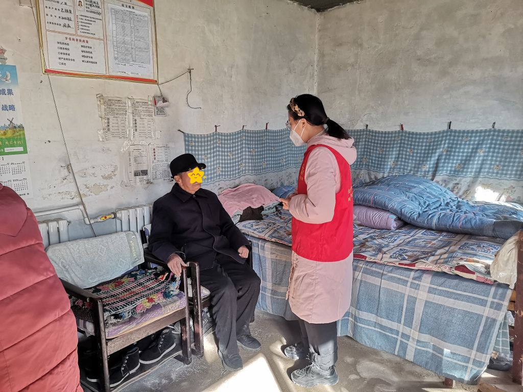 在一位残疾老人的家里,社工们查看老人的药,叮嘱老人平时注意饮食习惯,普及用药安全知识,并为老人打扫卫生,提醒老人在家要注意用电安全,注意保暖,老人一直对我们连连道谢,夸现在的政策好,对社工们的到来很开心。