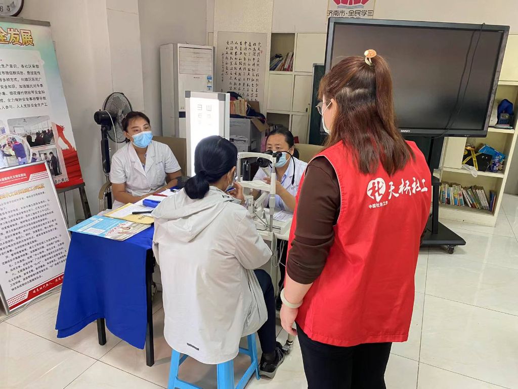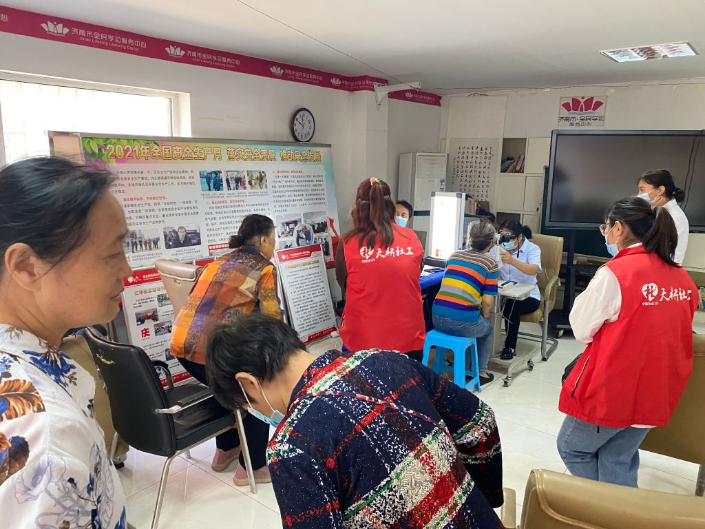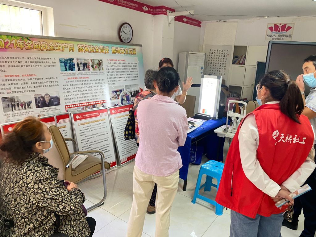活动当天,社工站早早来到现场同社区工作人员布置好义诊场地,准备好所需器具。随着老年人陆续来到义诊现场,医务人员们本着“早发现、早诊断、早治疗”的原则,通过视力测试、验光等手段,认真地为前来就诊的老年人进行病史询问、视力检查和眼病检查,社工从旁协助,配合医护人员向老人们耐心细致地讲解眼科疾病的基本常识以及预防知识。