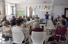 活动开始前,社工通过简单的《百变的小手》手指游戏活跃现场氛围,通过锻炼大脑和肢体相互协调的方式带领老人提前进入学习状态。活动中社工首先带领老人复习了上次活动学习的几个穴位内容,随后社工又为老人们讲解了几种穴位的相关知识,包括如何精准的找到穴位、穴位的按摩方法、每个穴位的具体疗效等,社工一一耐心讲解,同时社工会通过示范指导老人们找准穴位进行按压。