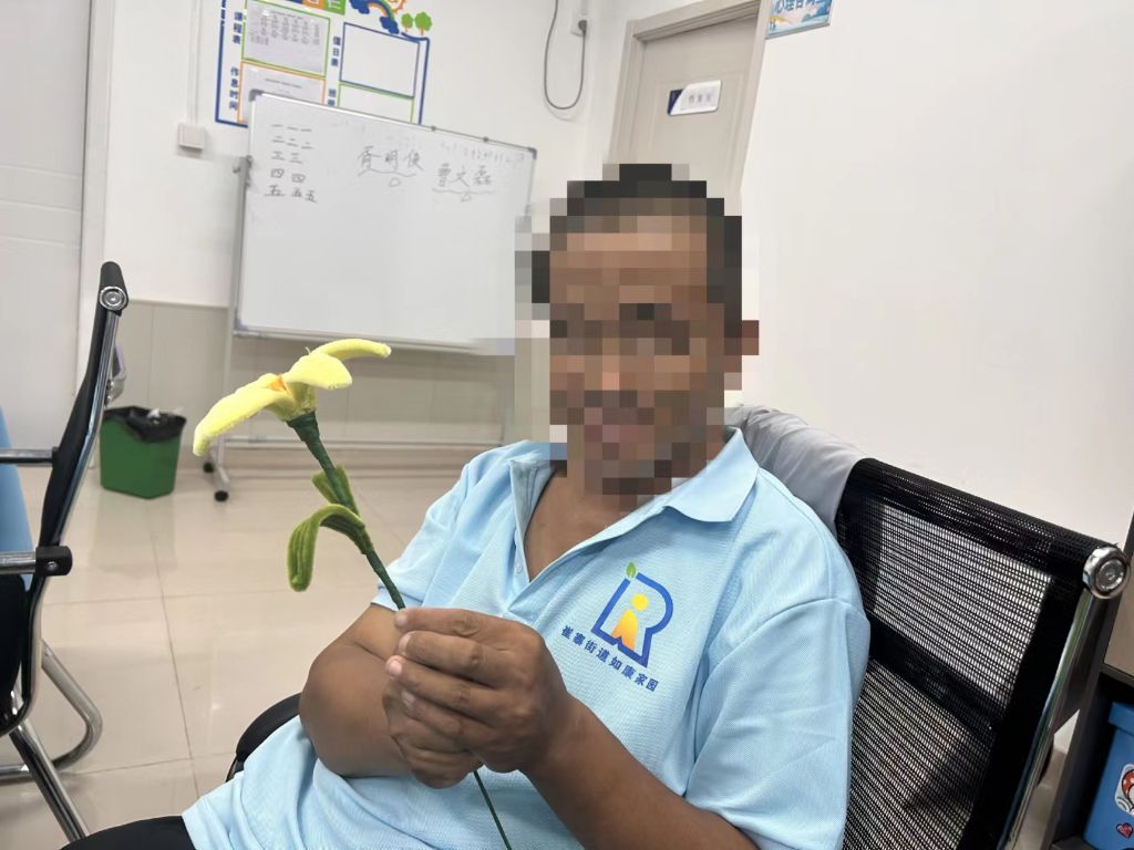 到了扭扭棒环节,社工细致地讲解了扭扭棒的制作技巧,组员们围坐在一起,目不转睛地学习着每一个步骤。他们的手指在扭扭棒间灵活穿梭,虽然动作略显笨拙,但眼中闪烁着认真与坚持的光芒。在制作过程中,组员们互相帮助,共同解决问题,每完成一个花瓣,他们都会相互鼓励,分享成功的喜悦。