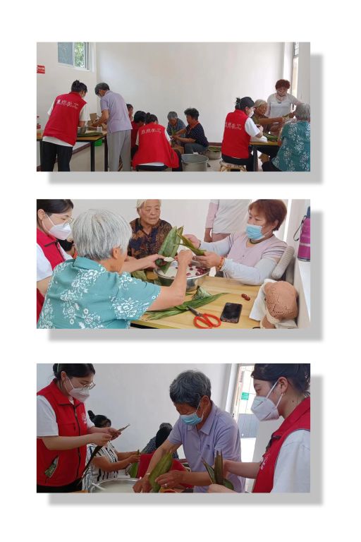 活动现场,社工与村委人员提前将准备好的粽叶、糯米、红枣、白砂糖等食材摆放好,社工与服务对象及管家河村志愿者们围在一起,大家麻利地拿起两片粽叶,折成漏斗状,填入糯米和红枣,压实、封口、捆扎,手上翻转飞舞之间,制作出棱角分明的漂亮粽子;也有人毫无经验,手忙脚乱地包成了歪歪扭扭的粽子。在制作过程中,大家彼此帮助分享,欢声笑语,其乐融融,营造浓厚的节日氛围,大家在劳动中充分感受到了传统节日的乐趣。