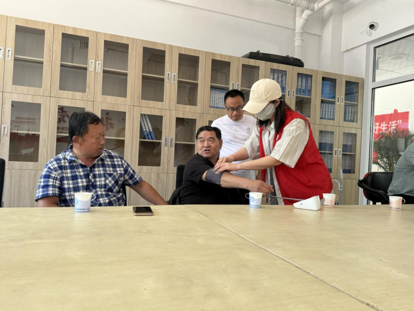 社工为现场居民进行血压测量,并根据测量指数给出合理的饮食建议,劝导血压较高的村民,进一步详细测量并让医生给出用药指导。同时还向老年人普及老年健康运动知识,提醒人们重视日常身体健康,倡导“三减三健”健康理念,使参与者对高血压形成了更深层次的认识,促进村民的健康生活方式。