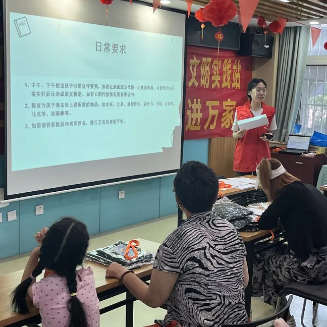 在召开暑期班家长会上,社工向家长介绍今年暑期班的服务内容与课程设置。志愿者在会上介绍了开设暑期托管班的目的和日常管理要求,强调了课堂纪律、制度及安全问题等,同时为各位家长答疑解惑,落实托管服务中的诸多具体细节。各位家长还在现场签署了托管协议,购买保险,为孩子的安全增添一重保障。课程设置方面,今年的暑期班除了基本的暑假作业辅导外,还依据社区资源优势,开设丰富多彩的艺术、文体、科普活动,同时穿插开展爱国主义教育、安全教育等,让孩子在有意思的假期活动中玩有所乐、乐有所获,引导孩子全面发展。