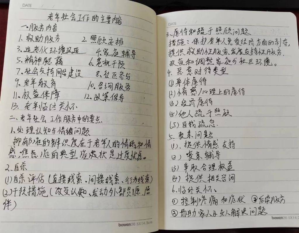 通过认真学习老年人服务内容,社工了解到我们要帮助老年人处理和协调老年人的人际关系问题,使老年人与他人良好互动,包括但不限于老年人之间、老年人与工作人员、老年人与亲属的关系。社工要运用社会工作的理论与技巧,对心理方面出现问题并企求解决的老年人,通过语言或者文字的交流,共同讨论找出引起心理问题的原因,分析问题的症结,进而寻求摆脱困境解决问题的条件和对策,恢复心理平衡、增进身心健康。对处在危机情境中的老年人,应首先保障其安全,再提供服务。协助老年人发挥潜在的能力,利用人际支持网络以及社会资源,恢复自尊与自信,培养自主能力以面对和克服危机。