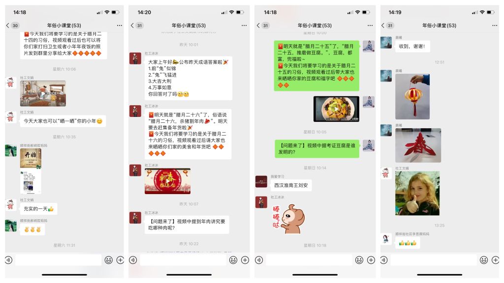 从互动开始,以融入为目的。为了促进辖区青少年儿童的小组活动融入感和积极性,社工站还在活动过程中设计了年俗竞猜和有奖竞答的环节。每日的年俗竞猜成为了小组活动的热门项目,也成为了青少年儿童参与年俗小课堂的动力和社工站促进辖区青少年儿童融入社区活动的手段。