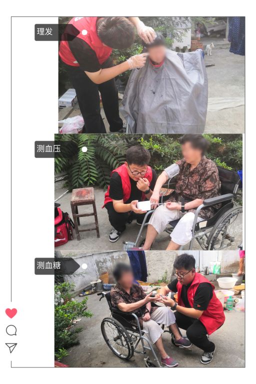 与朱大娘初次建立服务链接是在2022年春季的一次入户走访中,社工来到三泉峪村残疾老人朱大娘(化名)家,在与朱大娘沟通交流中了解到,朱大娘2015年因脑血管疾病致残左手不能活动,现病情日益严重,生活基本不能自理。2022年社工联系街道残联协助申请辅助器具轮椅、坐便椅等工具;今年端午节期间社工为朱大娘送去粽子和艾草,朱大娘拉着社工的手说“小曾啊,什么事都想着大娘,大娘真是非常感谢你”。本次服务中社工用“1+1惠彩服务包”为朱大娘测量血压、血糖;因出行不便朱大娘许久未修剪头发,社工立刻化身理发师为朱大娘修剪起头发。紧接着社工与志愿者一起为朱大娘整理茶几、床铺,打扫地面卫生,擦拭电视、餐桌等,不一会朱大娘的家焕然一新。临走时,社工叮嘱朱大娘夏季要注意饮食卫生和安全,关好门窗,好好保重身体,有需要可以随时与社工站联系。