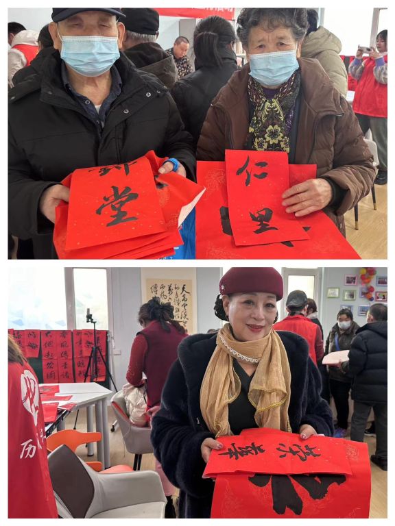 活动现场,社工们和辖区的书法爱好者们齐上阵, 楷书、隶书、行书等各种字体随墨香飘扬,一张张喜气洋洋的"福"字和一副副飘散着清新墨香的春联接连完成。随后,社工们也把写着“福”字和饱含幸福、温情的春联凝聚成一份份真挚祝福送给前来的居民。