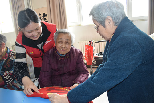 住养老人围在桌前,对着旗帜穿针引线。有的老人坐着轮椅行动不便,仍旧坚持亲自动手参与;有的老人年近百岁视力衰退,仍然认真专注,穿针走线一丝不苟。他们将敬党爱党之情一针一针绣进鲜红的旗帜里,每个住养老人的脸上都洋溢着幸福的笑容。
