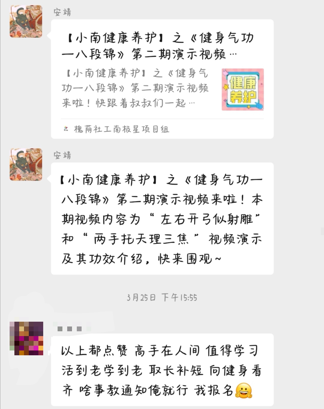 “小南健康站”以建立腊山街道老年人线上健康知识网络体系为目标,通过“小南健康速递”服务板块推送与老年人相关的政策法规及政策解读文章,搭建线上信息获取平台,畅通服务对象获取相关政策、信息的路径;通过“小南健康养护”服务板块推送服务对象掌握的养生健身知识、妙招等,建立服务对象线上信息交流、分享平台。服务过程中,社工将微信群组作为媒介进行线上服务推介,扩大了服务的影响力,受到了服务对象的一致好评。