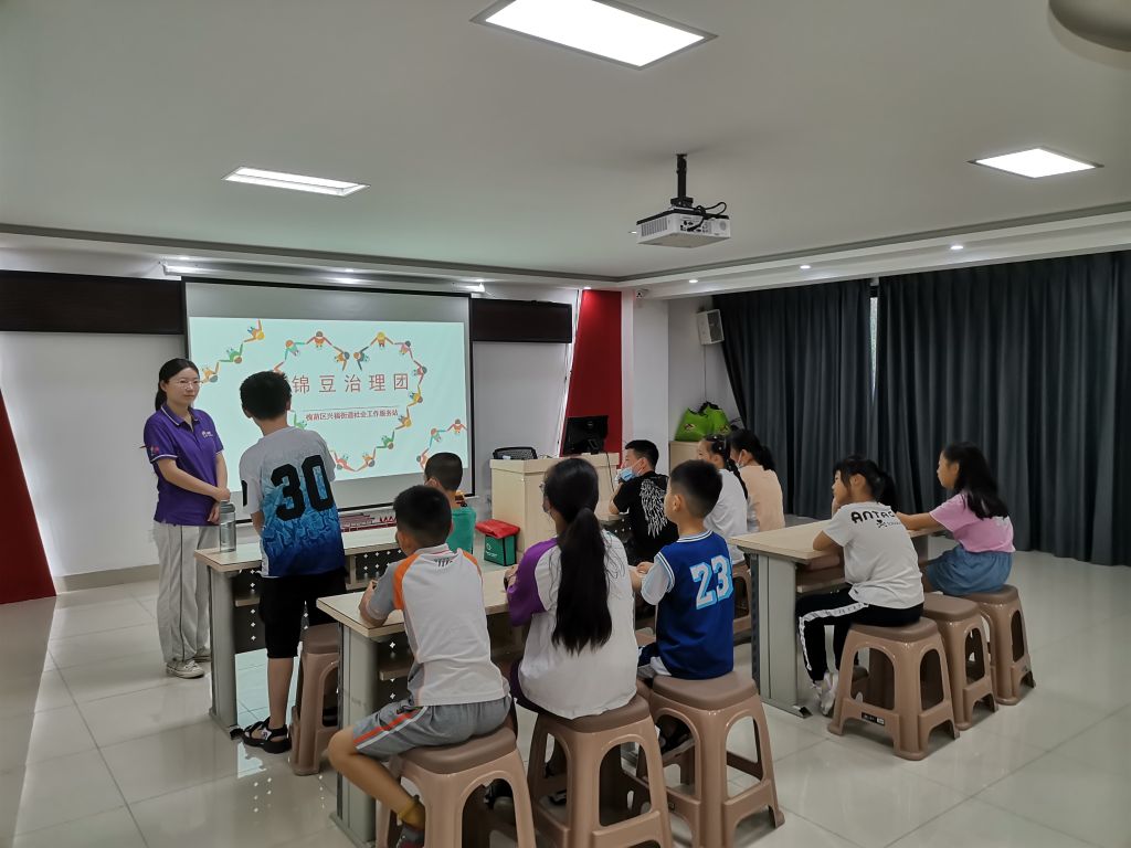 社工前期通过社区调研和书记访谈,整合撰写了锦绣城社区三项清单,将目前存在的居民参与社区治理渠道的需求,与社区周边中小学教育资源优势相结合,决定将社工室第一站流动至锦绣城社区。社工通过线上、线下多渠道招募方式,邀请适龄儿童成立“兴福·流动社工室:锦豆治理团”,提升儿童参与社区事务的能力,推动社区治理新发展。
