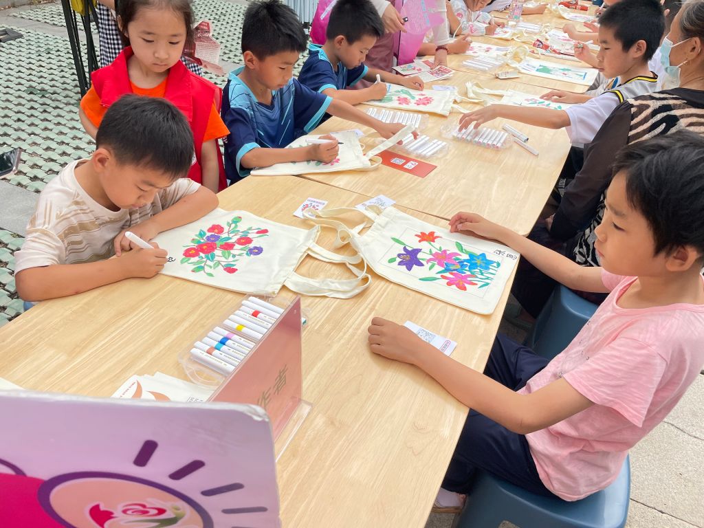 为庆祝中国共产党建党纪念日,6月22日上午,榆山街道主办的“五社联动”公益集市盛大开幕,榆山街道社工站作为此次活动中社会工作的重要组成部分,邀请平阴县社工总站积极参与并主导了以“手绘帆布包”为主题的特别环节,旨在通过艺术的形式传递党恩与关爱,同时关注儿童的身心健康。