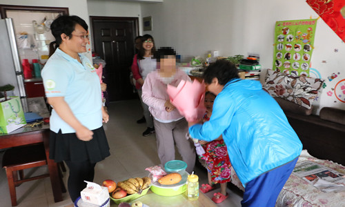5月12日早上,槐荫“新映象”项目组社工与社区工作人员带着鲜花采用入户访问的方式,为隐蔽长者母亲们送去节日的祝福。德裕家园的刘阿姨(化名),女儿因为小时疾病致残,一直照顾女儿无暇他顾。经过社工的一番努力,当刘阿姨接过女儿递过来的鲜花时,她说:“照顾孩子几十年第一次收到孩子亲手送的花,真的很感动”。