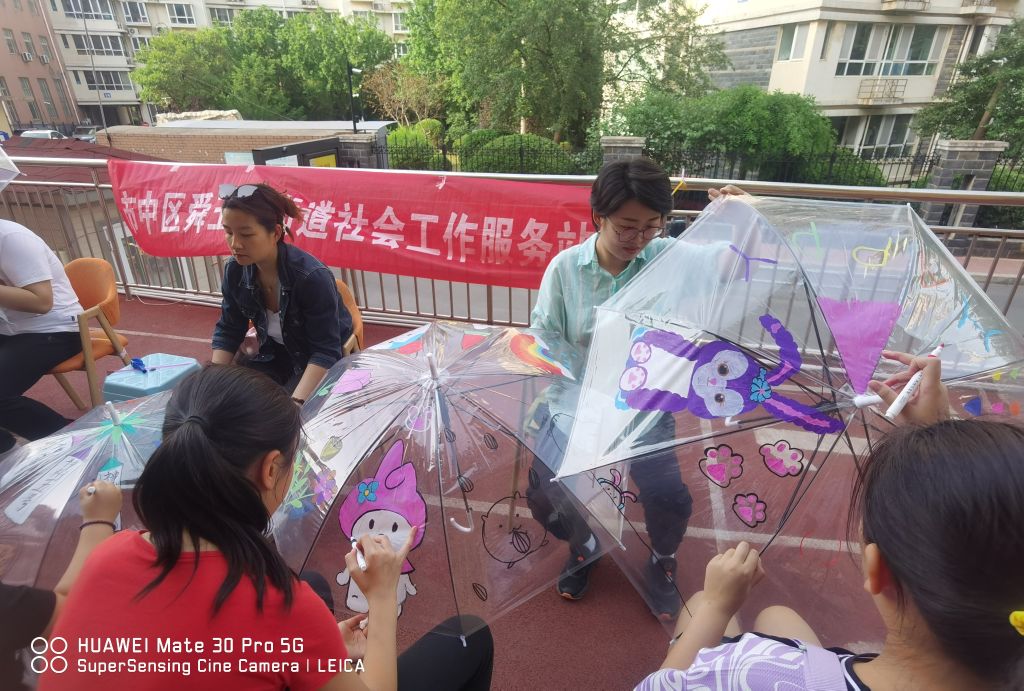 活动开始,社工向孩子们分发彩笔和伞,简单介绍手绘花伞的特点和制作方法。在了解绘画方法技巧及制作过程之后,孩子们迫不及待地开动脑筋,发挥丰富的想象力,用巧手去创造,用心灵去感悟。