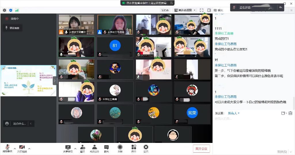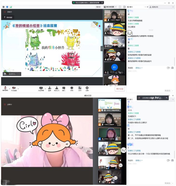 根据皮亚杰认知发展阶段理论,6-12岁的儿童正处于建立具体的逻辑思维能力,开始学习理性分析事物的阶段,在这样一个成长的关键阶段,儿童作为情绪的个体,情绪体验较多但控制能力不足,对于疫情的关注加之生活空间的缩小会让儿童在认知、情绪、行为、人际交往和躯体方面产生一些不良反应,5月14日,槐荫区未保中心开展“情绪魔法师”线上小组活动,采用小组工作的方式,为21名儿童介绍了情绪的相关知识,倾听他们在疫情期间的情绪体验,借助小组动力,帮助儿童了解、支持他人与自我的情绪表达,协助他们学习接纳并妥善处理自己的情绪,获得正确的认知发展。