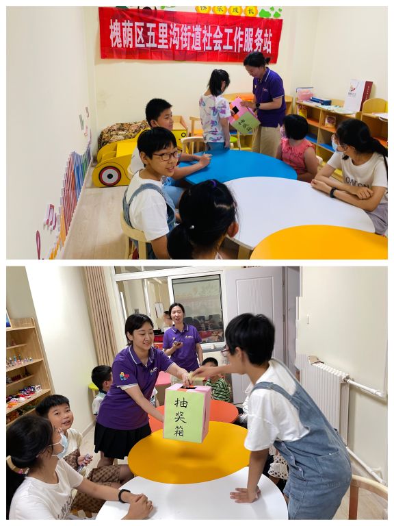 随着小组成员由完全陌生到逐渐开始交流,社工站社工组织他们以抢答问题抽奖品的形式来打破小组成员间的陌生感,从而让小组开始走向融合。抽奖过程中,小朋友们争相抢答问题,抽到奖品的小朋友与身边的小组成员分享喜悦,现场气氛变得轻松愉快。