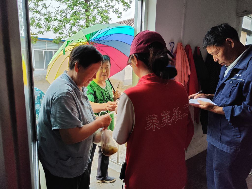 一大早,社工们就来到了幸福院,开始忙碌起来。大家分工合作,默契配合,帮助村里的工作人员洗菜、切菜、切肉、分装馒头。在大家的共同努力下,一顿丰盛的午餐便准备好了。随后社工向陆陆续续前来领餐的老人分发餐食,并叮嘱他们小心拿好,回家路上注意安全,同时做好领取记录工作。