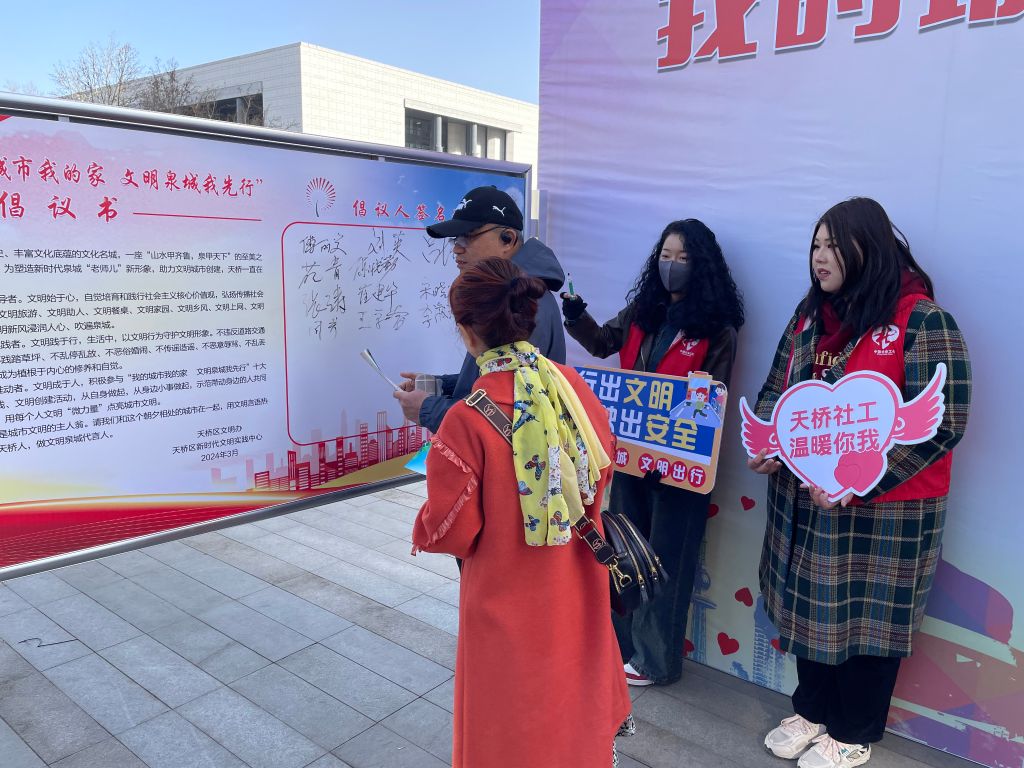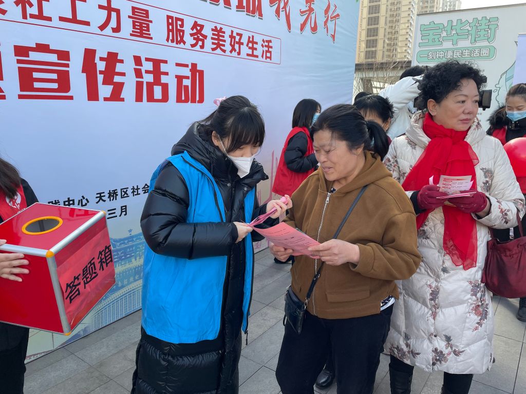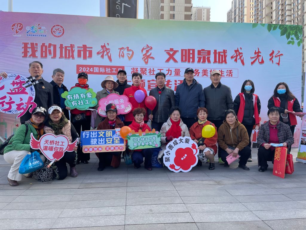 “春种一粒粟,秋收万颗子。”在这个播种希望的季节,广大社工迎来了第 18 个国际社工日,为弘扬社会工作专业精神,提高社会工作认知度和影响力,展示天桥社工发展成果,3月19日上午,在区民政局的指导下,总站及各街道社工站在K88名泉广场,动员辖区内社会组织、志愿者、公益企业资源等,以多样化的服务形式,围绕“汇聚社工力量,服务美好生活”社工日主题,开展天桥社工国际社工日宣传活动。
