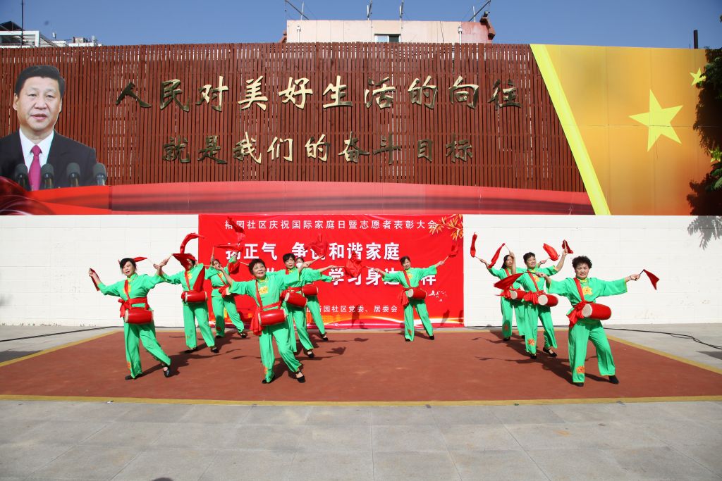 (志愿者们进行腰鼓表演)