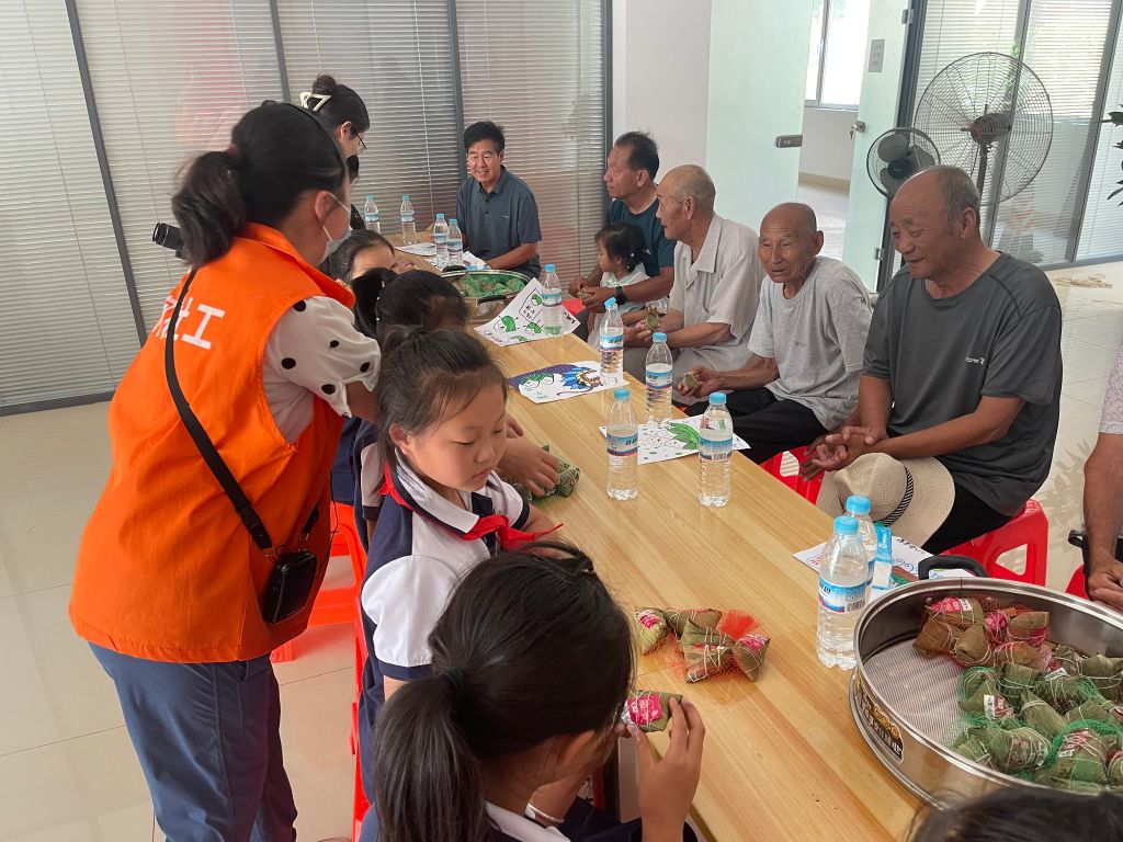 然后,毛毛又跟孩子们一起将蒸好的粽子一一送到爷爷手中,祝他们端午安康。老少同聚乐陶陶,大家一边品尝美食,老党员还给孩子们讲述抗战的故事,孩子们认真听着,一颗颗爱党爱国、尊老敬老的种子在心中悄然发芽……