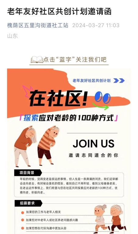 为有效发动辖区慈善力量,社工站采用线上线下宣传方式。一方面,社工站设计制作“在社区,探索应对老龄的100种方式”招募海报,通过微信公众号、张贴海报的形式号召辖区慈善组织参与;另一方面,社工站电话联系辖区企事业单位,介绍老年友好社区共创计划服务内容和“盟友”招募要求,以及社工站可以为共创“盟友”提供的平台支持,邀请辖区企事业单位加入。