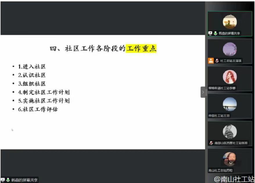 为更好的推进社工站深度扎根、提高社工的专业服务水平,5月28日,南山社工总站组织各街道社工站参加青羽赋能计划线上培训。此次培训特邀请山东建筑大学社会工作专业韩晶教授为社工进行社区工作方法的培训。