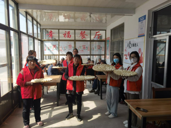 老年人三两相邀的走进幸福院,有序就座,乐呵呵的唠着家常;社工和幸福院志愿者细心为前来用餐的老年人提前规划好分工,并对已入座的老年人进行聊天等精神陪伴。老年人说着感谢的话语,“感谢镇上对我们这些老年人的政策,还有社工这些小姑娘聊天、解决问题,幸福院的用餐环境和卫生我们也很满意。”