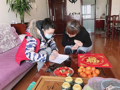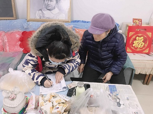 2月4日上午,项目组社工与老年志愿者电话约定好时间后逐一入户探访。项目组社工在向老年志愿者赠送福字大礼包的同时,还向他们讲解了民政局最新下发的志愿服务管理办法,完善了前期登记的志愿者的信息,并向他们询问了有关志愿服务管理细则的意见和建议。