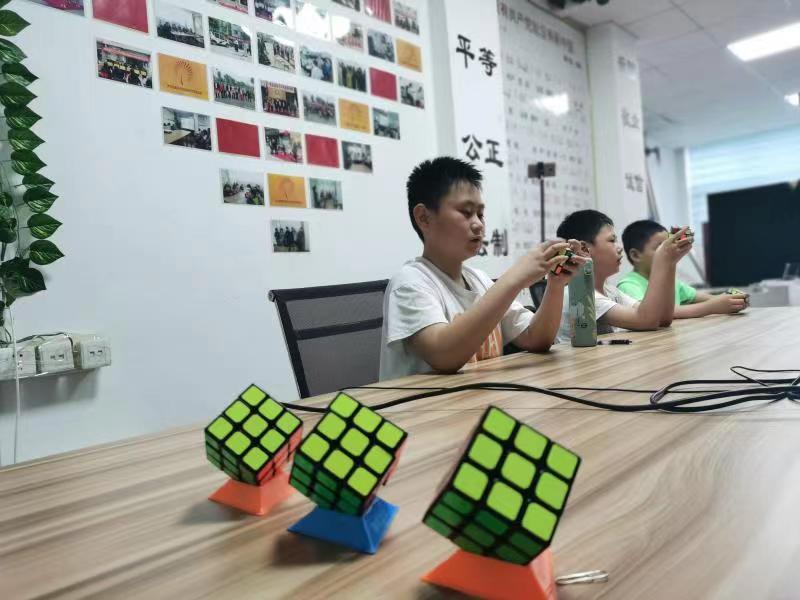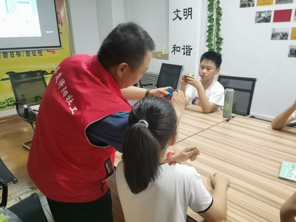 课堂上,社工首先讲解了魔方的诞生、结构以及种类,让孩子们对魔方有了初步认识。接着开始给孩子们演示魔方的左右手公式,每一个步骤、每一个动作,社工都讲的非常详细,一边讲解一边做演示,孩子们认真听讲、仔细的模仿,在练习的过程中,社工针对每个孩子出现的问题都耐心的指导,并引导孩子们之间建立了互相帮助关系,先学会的孩子帮助还不熟悉的孩子,这不仅保证了组员之间整体学习进度,更进一步提升孩子们之间的沟通交流。