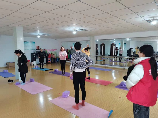 活动开始前,社工提前来到现场布置场地,准备瑜伽垫等运动器械。此次活动邀请教学经验丰富的瑜伽教练指导授课,活动在舒缓的音乐声中开始,妇女学员们跟随老师认真地练习着一个又一个动作,在动与静的结合中,放松身心,提高身体的协调性和控制能力。活动结束后,社工为妇女学员们建立了线上微信群,形成“线下+线上”的学习模式,方便大家互相交流、学习。