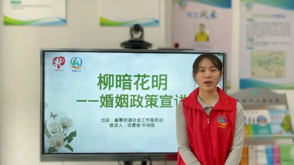 济南新旧动能转换起步区崔寨街道 社会工作服务站(以下简称“崔寨街道 社工站”)柳暗花明一—婚姻政策宣讲 开讲啦!为了提高居民婚姻家庭法律 意识,缓解婚姻家庭矛盾,提高居民生活幸福感。崔寨街道社工站建立“柳 暗花明”政策资源库,开展婚姻政策法规、婚俗改革宣传宣讲。以“社工+志愿者”的的形式进行视频宣传宣讲,使 服务对象能更直观的理解政策法规内 容,树立正确的婚恋观。
