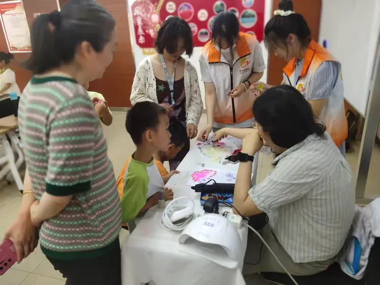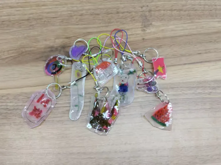 通过角色体验和社工介绍,孩子和家长都十分希望做些实际行动帮助残障人士,社工和大学生志愿者引导孩子DIY热缩片钥匙扣,并将做好的钥匙扣捐给社区,作为公益市集物资,进行售卖,为残障人士的生活提供支持。