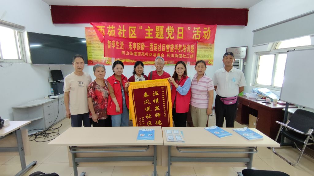 9月1日上午,药山街道社工站于西苑社区为老年人开办此系列课程的第六课。 正式上课前,一对老年学员夫妻早早来到教室,笑盈盈地从手里拿出一副锦旗,“这段时间真的辛苦你们了!这么耐心地教我们,还都是免费的。”锦旗上写着“春风送社区,温情显师德”,社工心里都暖暖的,握着叔叔阿姨的手说“叔叔阿姨,这都是我们应该做的,我们的工作目标就是服务好咱们社区居民,让大家生活愉快幸福!”。