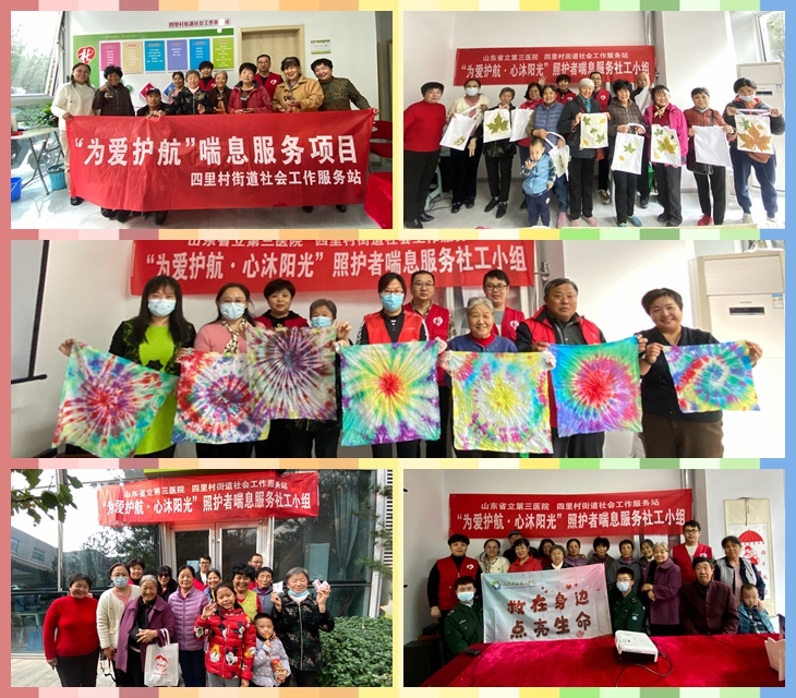 照护者喘息服务是为其创造喘息时间,提供满足需求的专业性喘息服务活动,并且运用社会支持理论解释照护者的社会支持,理论与实践的结合,更有利于帮助照护者缓解压力和建构社会支持网络,满足自我需求和期望,提高生活质量。因此,结合四里村街道照护者的特点,四里村街道社工站积极链接省立三院医务社工资源,以及医护志愿者、社区志愿者,通过医疗照护专业指导、社工提供心理支持、艺术减压,并辅以志愿者帮扶的方式,开展小组活动,使照护者找回自己生活的颜色,得到真正的放松、快乐,从心底享受沐浴在阳光中的温暖感觉。
