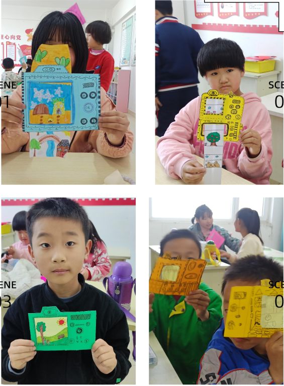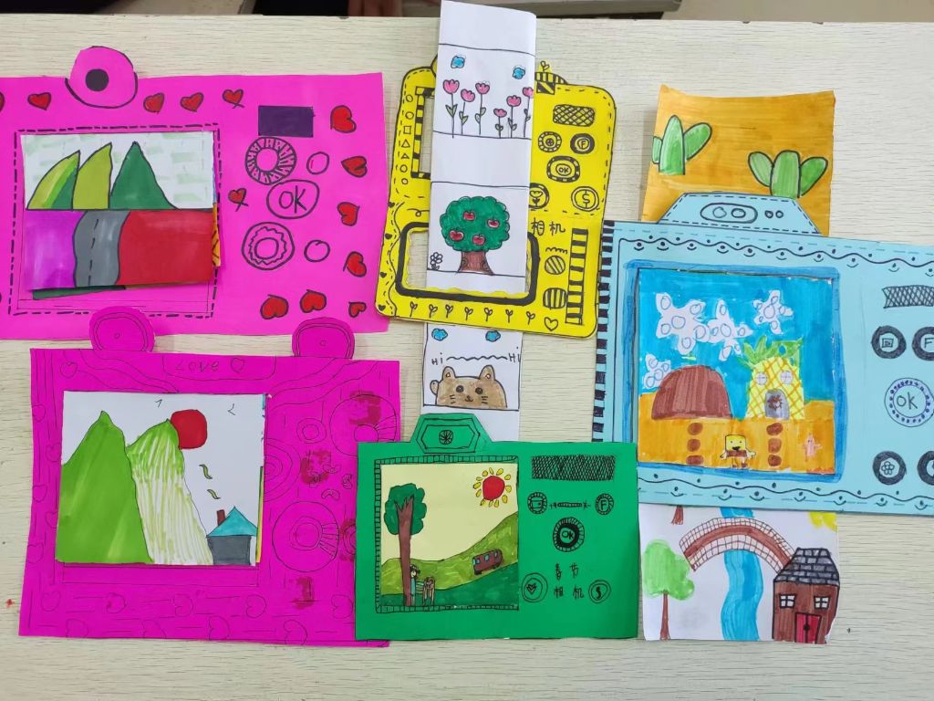 在活动过程中,社工和志愿者首先引导孩子们捕捉身旁春景,回忆曾用双眼记录过的世界,调动孩子们的感知能力和观察能力。之后,志愿者教授大家运用线描和手工的方式,画出心中所想的美丽风景,制作出属于自己的纸质相机。在熟悉与理解相机的基本结构之后,画笔在手中舞动跳跃,剪刀在纸侧掉头游走,孩子们的相机与风景胶片逐步显现。