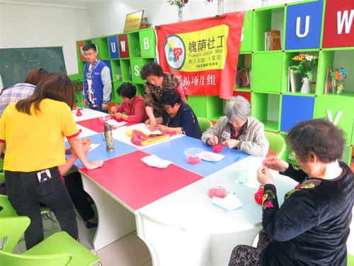 5月14日下午,山泉驻槐荫社工兴福项目组迎来了“乐融兴福·多彩人生”手工串珠的第三次小组活动,本次活动项目组是联手来自山东建筑大学社会工作专业的2名大学实习生及1名社区志愿者共同为组员提供服务。