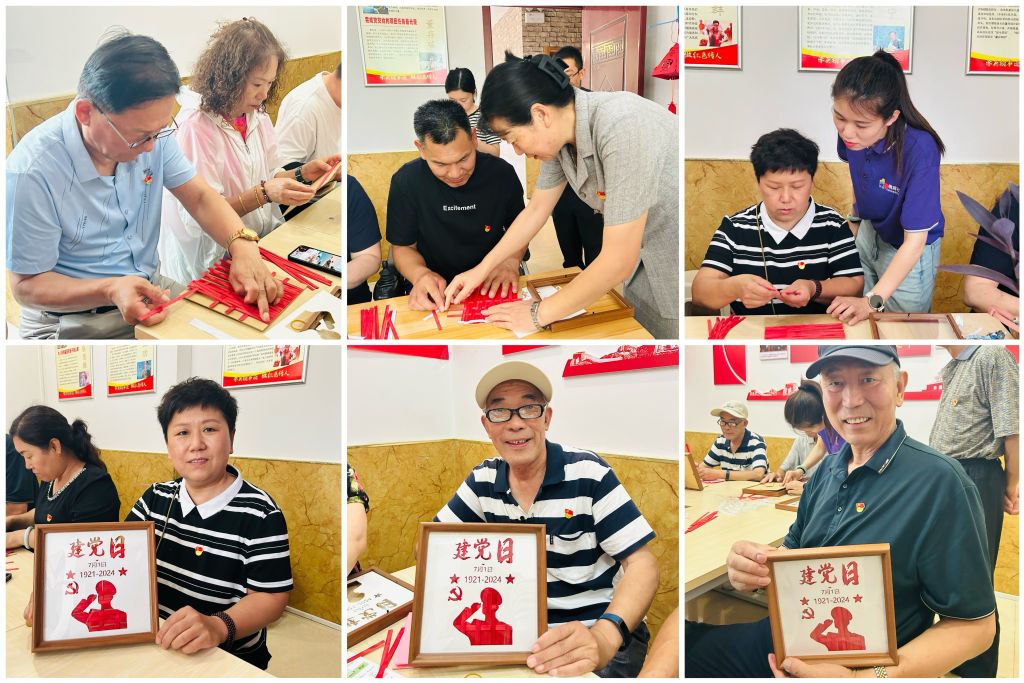 在红色手工忆党恩环节,社工站社工首先向到场的党员们致以崇高的敬意,并对他们为党和国家做出的贡献表示衷心的感谢。然后带领大家制作带有建党日图案的手工竹编,通过手工竹编这一传统工艺,传承红色文化,弘扬党的优良传统。在编制手工竹编的过程中,遇到有难度的地方老党员与年轻党员通力协作,展现出党的革命精神,同时,大家也通过这个交流互动平台共忆党的重要历史时刻,再一次深化了党员教育。