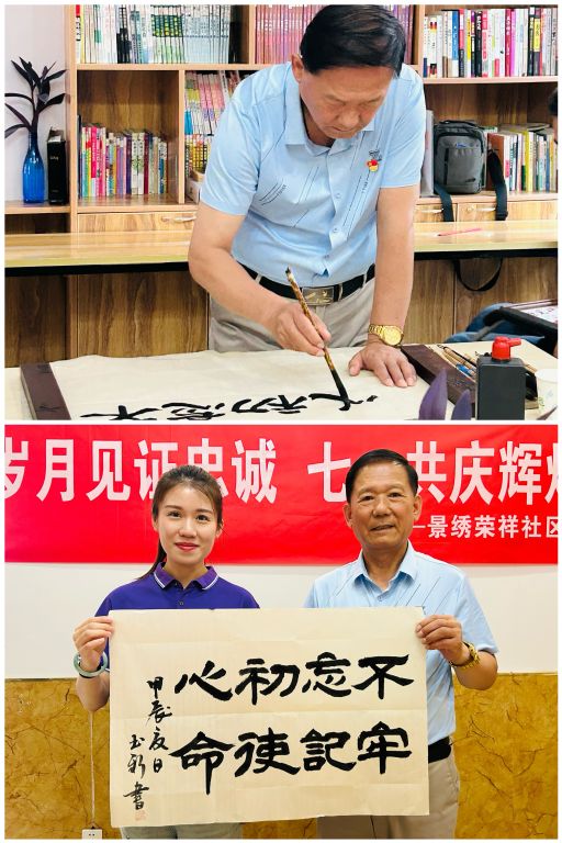 挥毫泼墨向党献礼环节,社工站邀请到党员中的“社区能人”房玉新,以书法的形式向党献礼,以满怀深情的笔触,书写下“不忘初心 牢记使命”、“跟党走”等表达党员忠诚信念和爱国情怀的字样。这份特殊的礼物不仅展示了党员们对党的热爱,更体现了他们对党深深的敬意和祝福。生日会近尾声,大家共同祝愿中国共产党繁荣昌盛,祝愿伟大祖国繁荣富强。