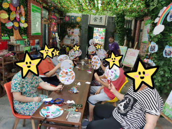 在小组成员们团扇即将完成时,一只喜鹊飞到了小院老杏树的枝头鸣叫,吸引了小组成员们的注意。“这是喜鹊来给我们报喜嘞!”其中一位小组成员惊喜道,以此为契机,社工引导小组成员聊起了家常,成员之间有了共同话题,成功搭建了支持网络。最后,在一片欢声笑语中,小组成员们纷纷完成了自己的作品,一朵朵美丽的花绽放在洁白如月的团扇上,勾勒出最美的中秋之景。
