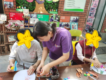随后由社工带领小组成员制作干花团扇,寓意“花好月圆人团圆”。刚开始制作时,个别小组成员会否定自己的作品,“我就是胡乱摆的,一点也没有审美,也不好看。”这时社工会用优势视角,从作品创意鼓励小组成员,给小组成员支持与动力。最终这位小组成员不但顺利完成了作品,还将自己的作品拍摄下来,发布在了短视频平台。“这样拍下来还挺好看的,你看刚发布出来就有人给我点赞呢。”