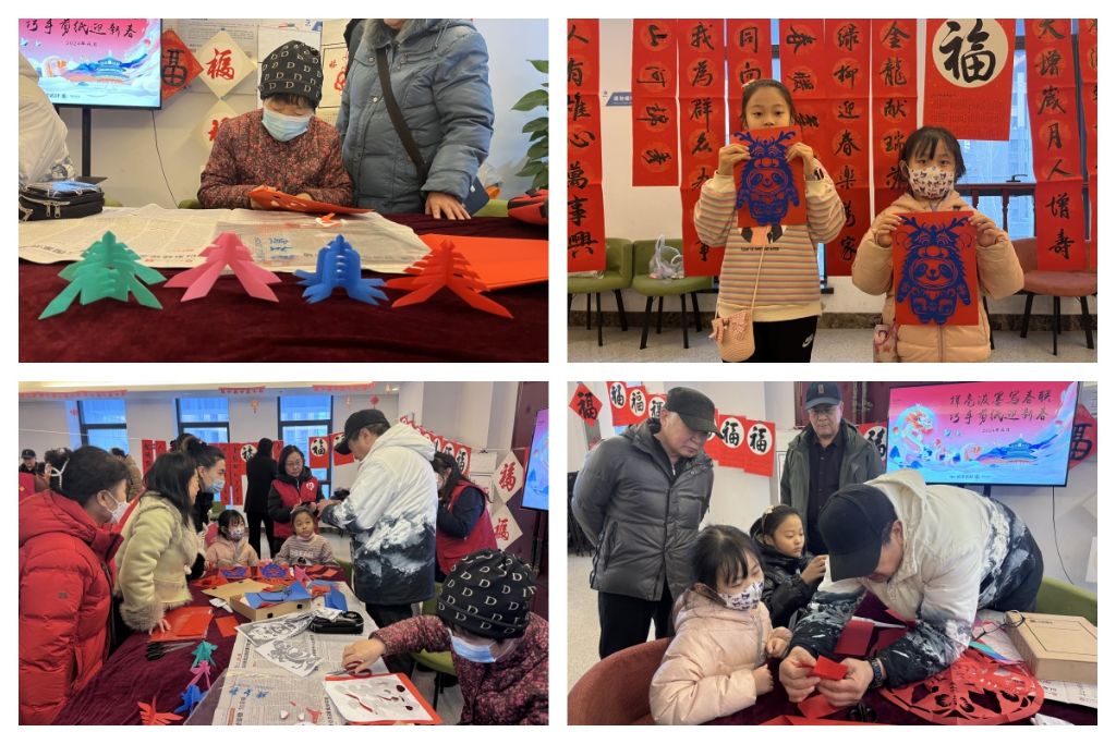 另一边则正在剪窗花,大家在老师的带领下剪出了立体的“春天真美”四个立体的字,小朋友还剪出了他们喜爱的冰墩墩,周围的人赞不绝口,几位阿姨也剪出一些吉祥的图案,现场气氛十分热烈。
