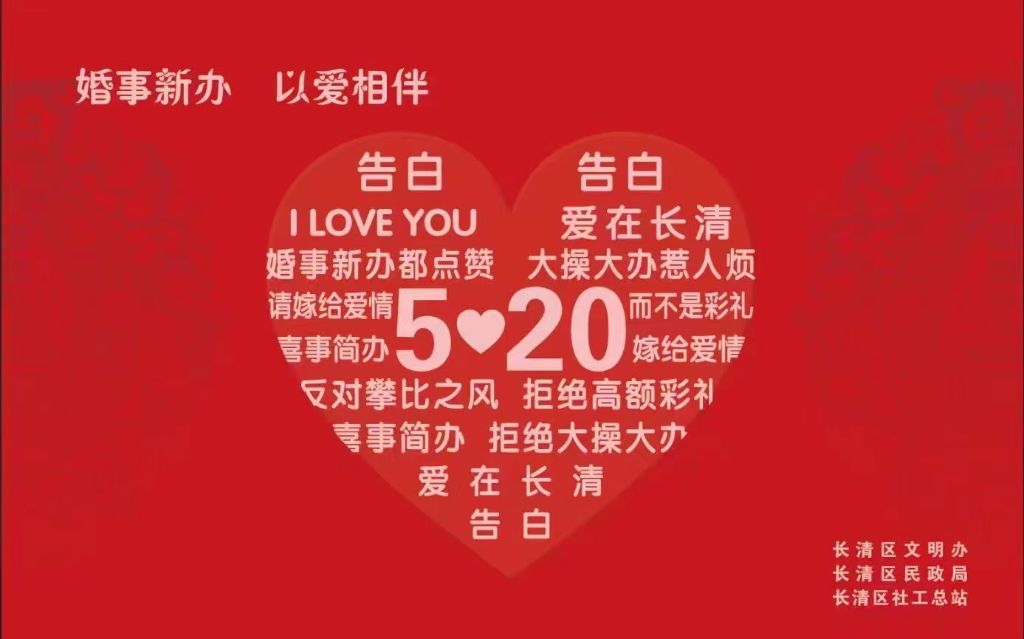520,我爱你!5月20日被称为网络情人节,在这个特殊的日子也掀起了“登记狂潮”。为了更好的倡导“移风易俗,弘扬文明”新风尚,扩大长清社工的社会知晓度与影响力,长清区文明办、长清区民政局、长清区新时代文明实践中心、长清区社工总站联合开展“婚事新办,社工与您相伴”主题宣传活动。