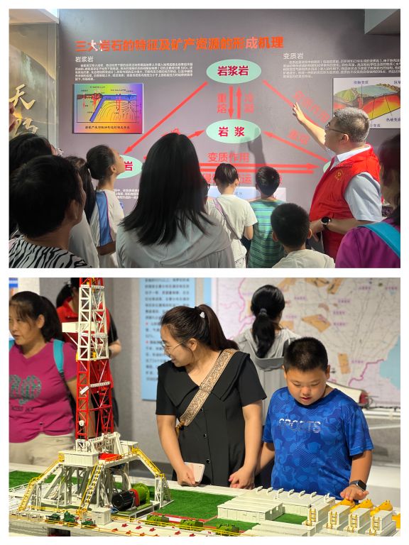参观中,《探矿古往今来》巨幅历史画轴,各种矿物、岩石及宝石,地质现象,地层、古生物化石标本均让青少年大开眼界。了解学习了地质运动、地球探宝、岩石和矿产形成、煤炭的形成、开采、利用和找矿的技术方法等更让青少年惊叹连连。其中,李昊桐小朋友的妈妈表示“太厉害了,我们人类能通过这样的方式认识世界。他们(探矿工作人员)能够做这样的工作也太厉害了。咱们街道能有这样的单位也很厉害”。